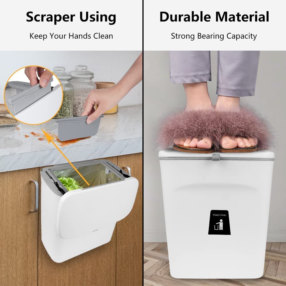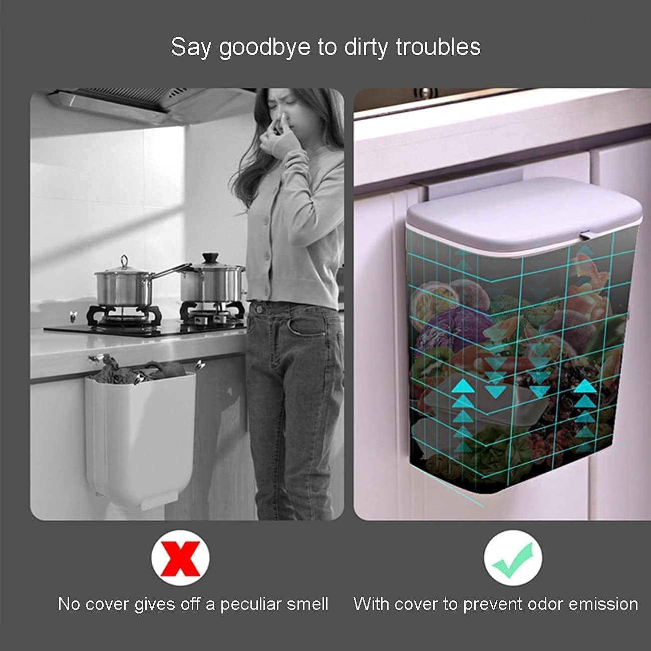 This hanging trash can have semi-automatic sliding lid design, there are two ways to open the lid,The lid is sealed which can effectively prevent the odor from escaping and also a good dog proof trash can. The lid of the trash can is designed to have an excellent sealing so there would be no unpleasant scent from the contents. Furthermore, the trash can lid can be open/closed through either lifting or sliding, making it convenient for most cook use. Widely used in the kitchen, bathroom, office, bedroom, living room, Camper, and more and more, Low-profile design, space saving and matches aesthetics of any places Key Product Features.