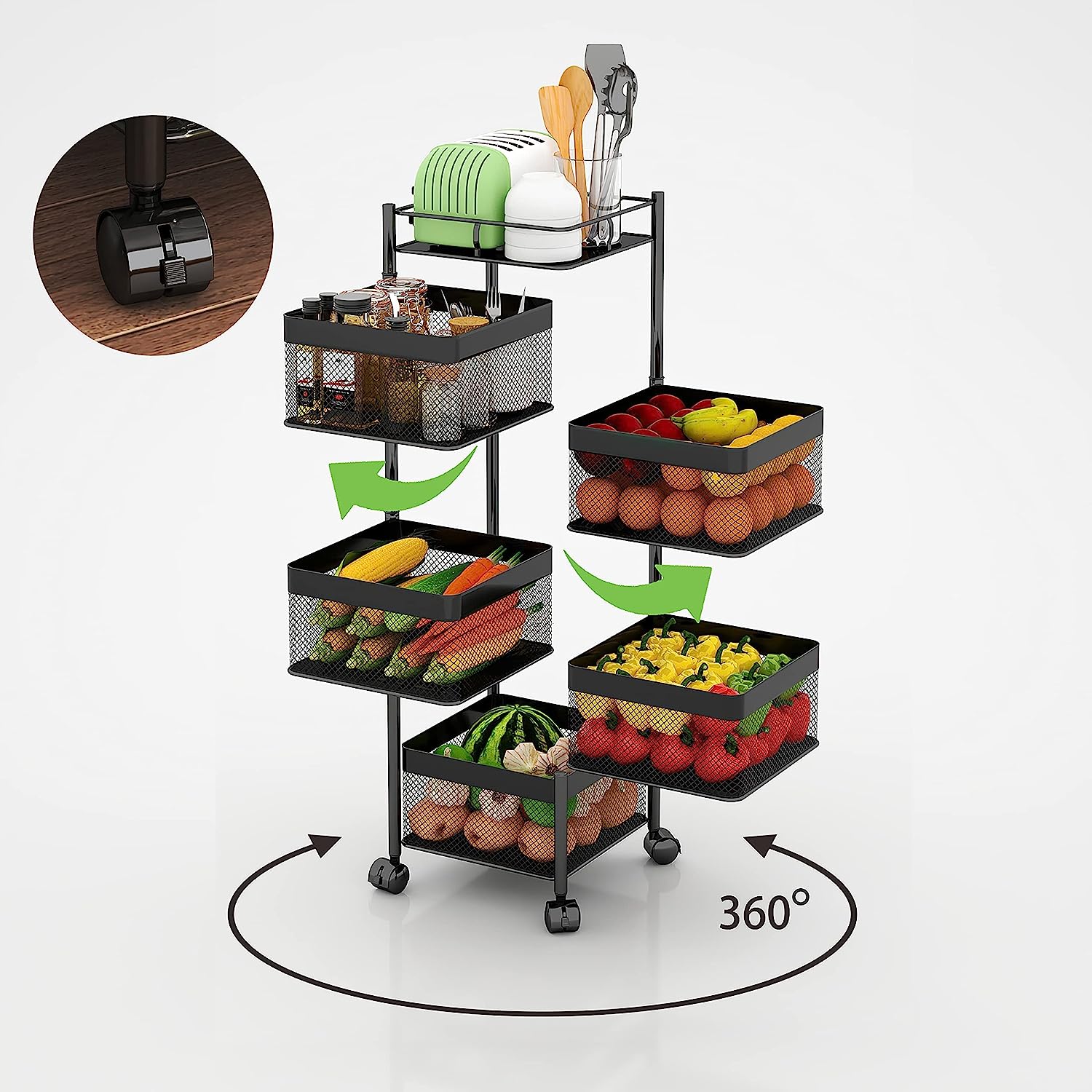 The Kitchen Storage Rack boasts a clever design that revolutionizes kitchen organization. Its multi-layer shelves provide ample storage space for various kitchen essentials, from pots and pans to spices and small appliances. The rotating feature allows for easy access to every item, eliminating the need for constant searching and shuffling. The floor-standing design ensures stability, and the included wheels offer mobility and flexibility, making cleaning and rearranging a breeze.