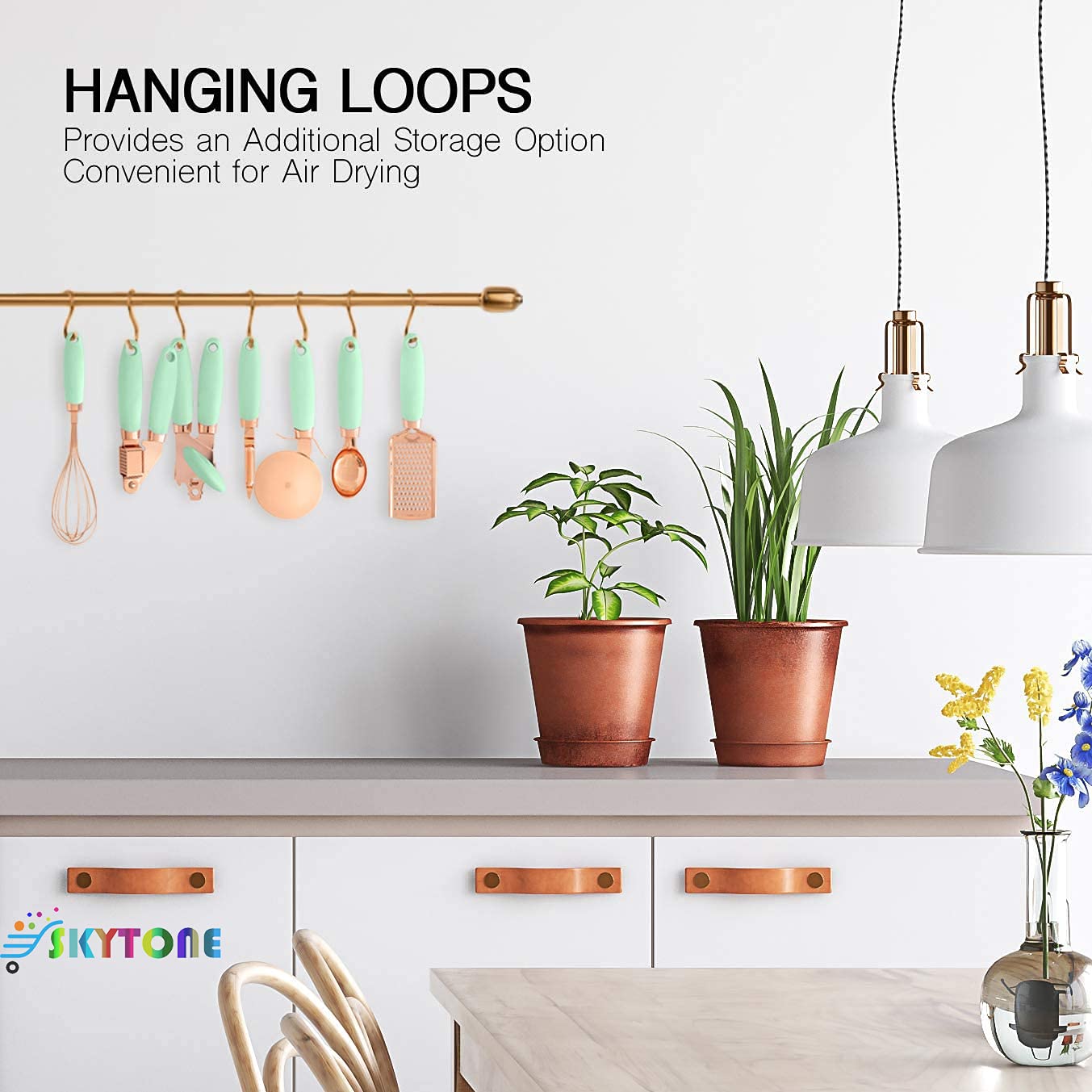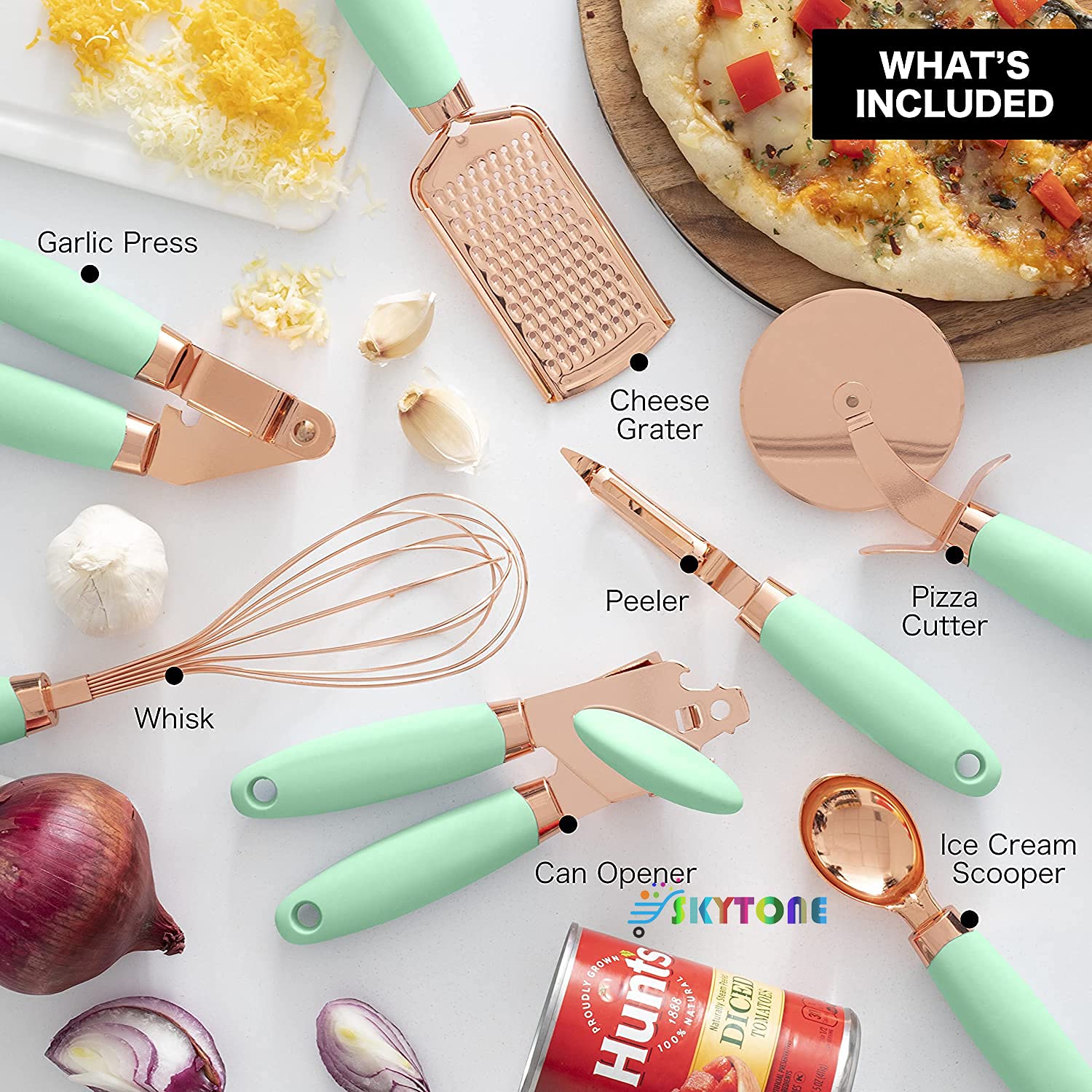 Update your existing collection with this must have trendy and deluxe. Cooper plated stainless steel gadgets with comfortable, soft touch, good grip, non-slip handles that absorb pressure and make it easier on your hands. Set includes 1 can opener (8.5″ long), 1 ice cream scoop (8.5″ long), 1 peeler (8.5″ long), 1 pizza cutter (8.5″ long), 1 garlic press (8.5″ long), 1 cheese grater (10″ long) and 1 whisk (12″ long).