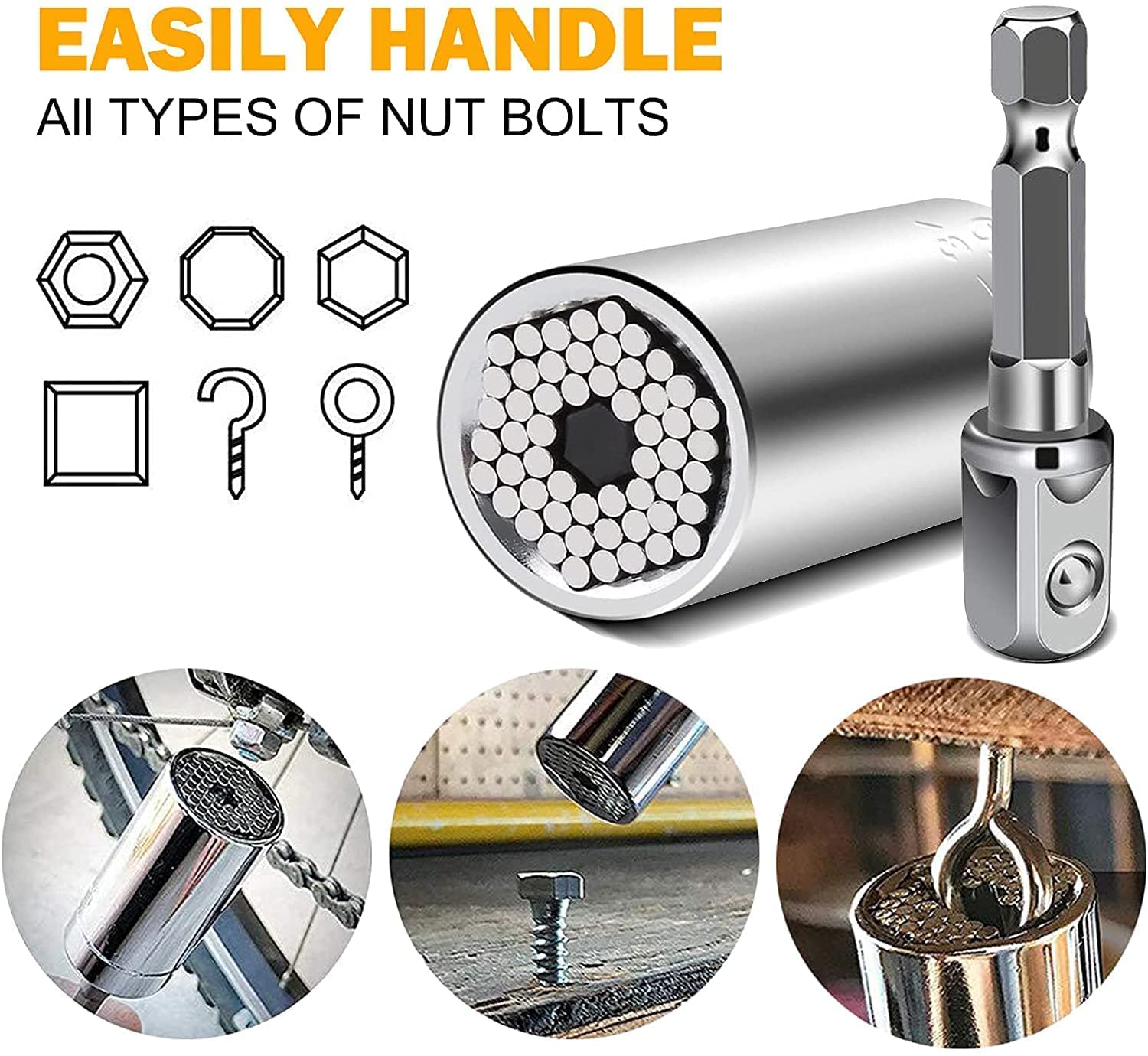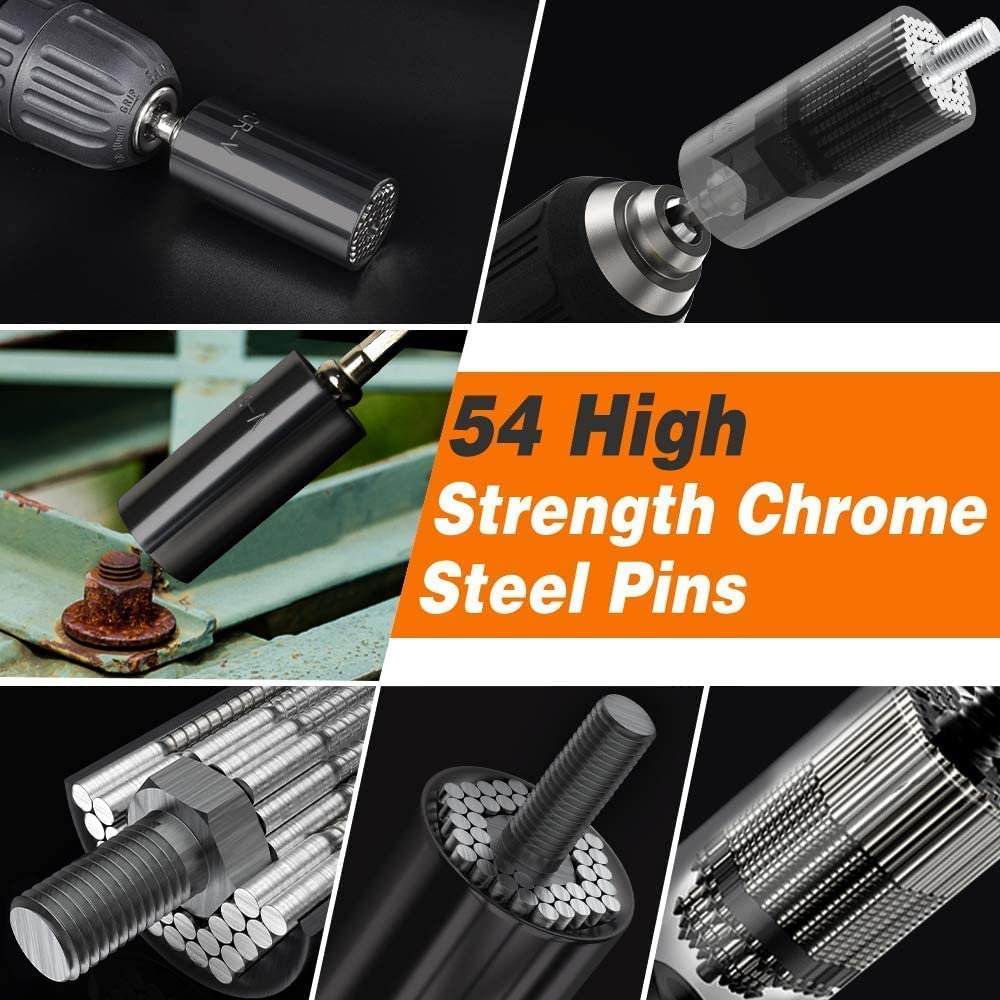 The Magical Grip Socket instantly adjusts to grip hex nuts, hooks, eye and lag screws, bolt heads, and other various shape and size objects. Stainless Steel construction with 54 individual hardened steel spring pins that retract to the shape of most objects. This durable and universal wrench can be applied automotive industry, household maintenance, manufacturing industry, construction and other industries.