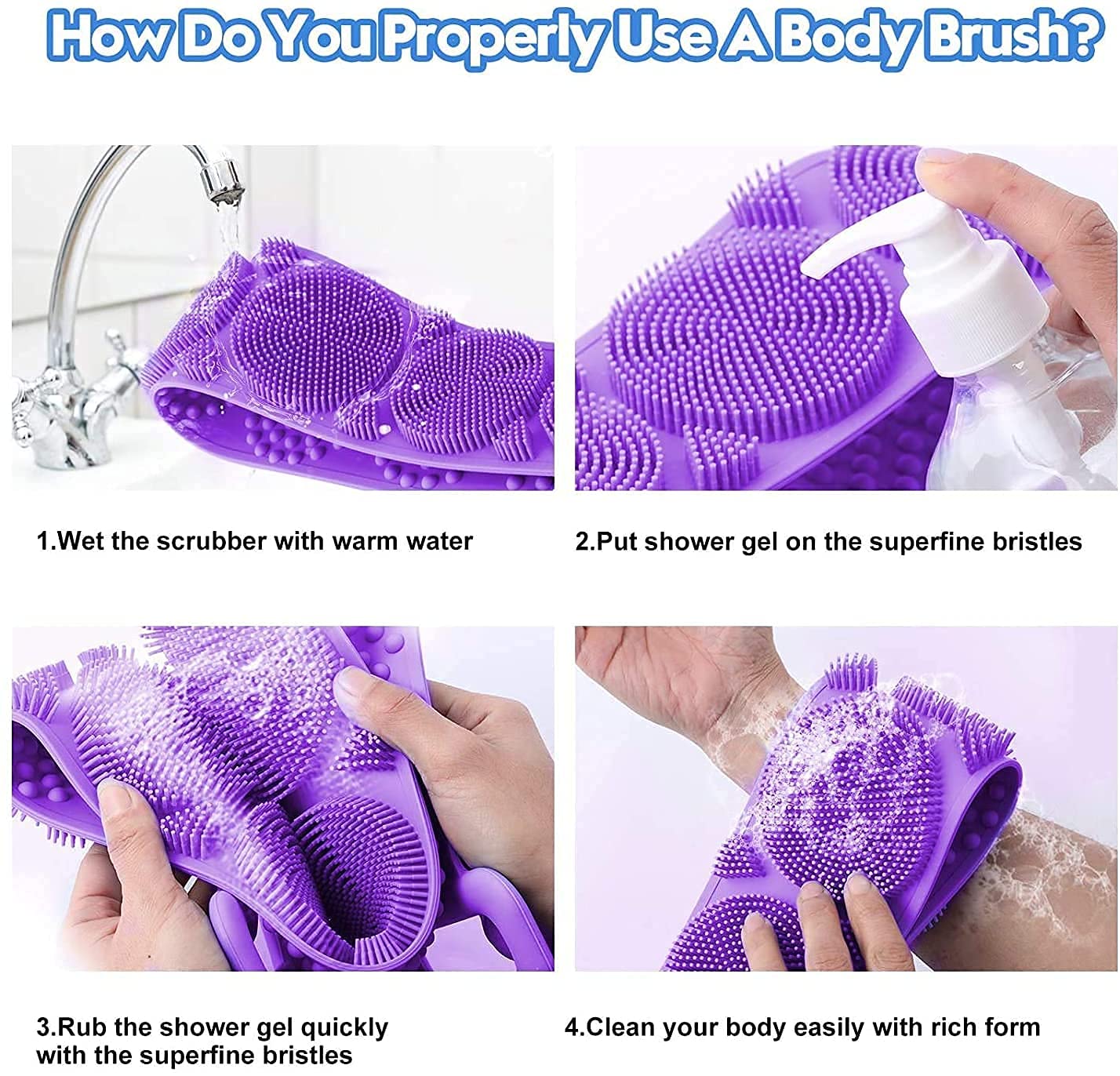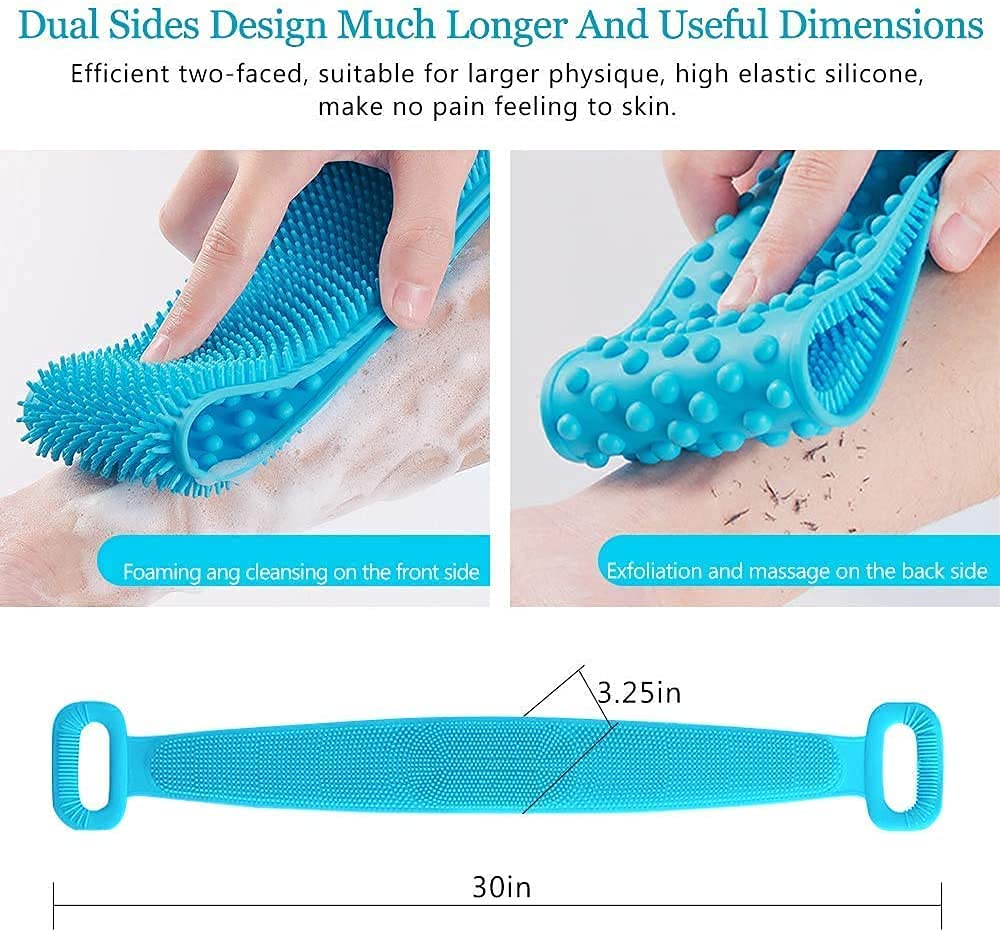 Silicone body back scrubber double side bathing brush for skin deep cleaning massage, dead skin removal exfoliating belt for shower clean. Made of 100% natural food-grade silicone. Our back washer for shower is easy storage, dry fast, washable and durable.