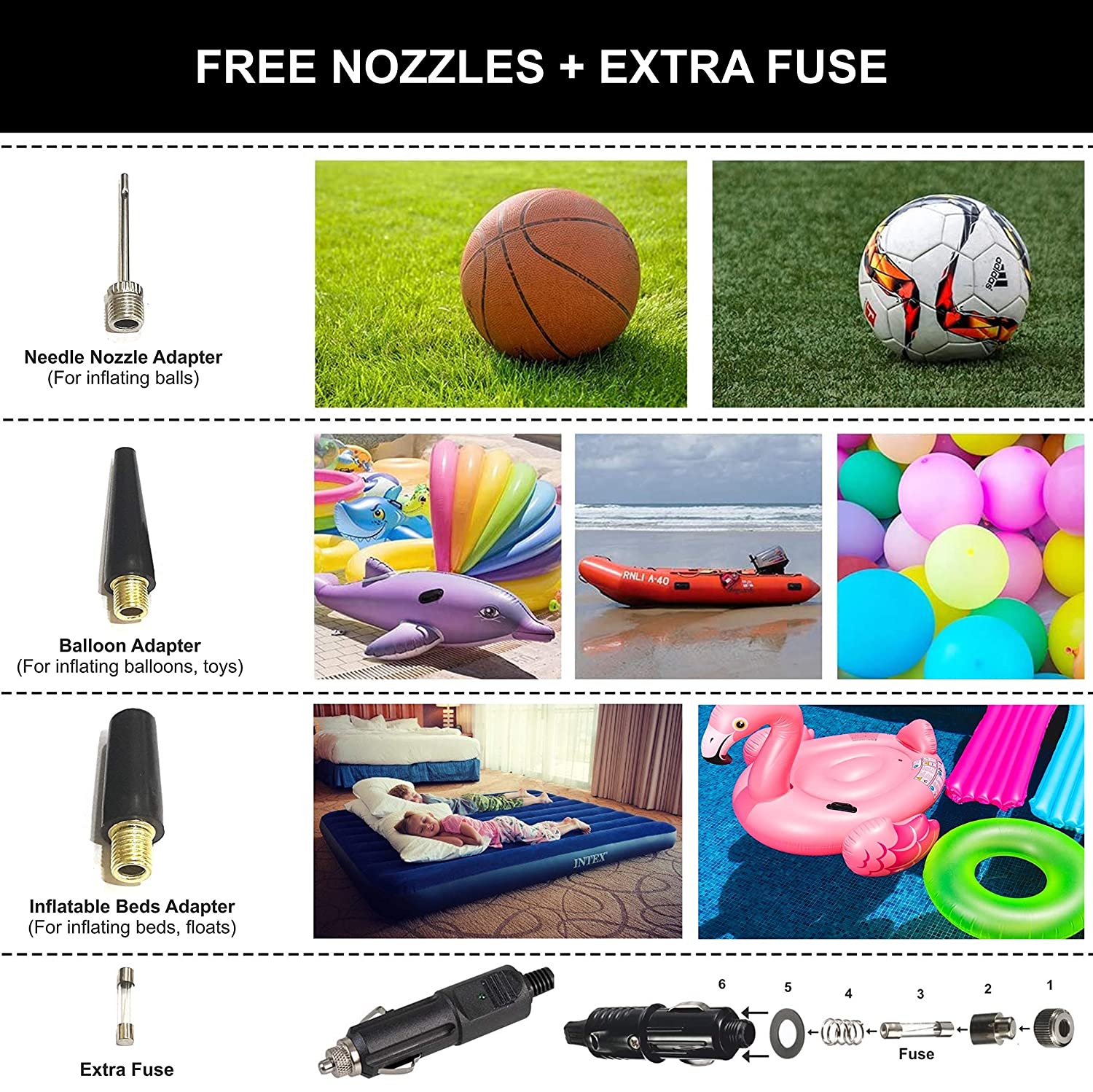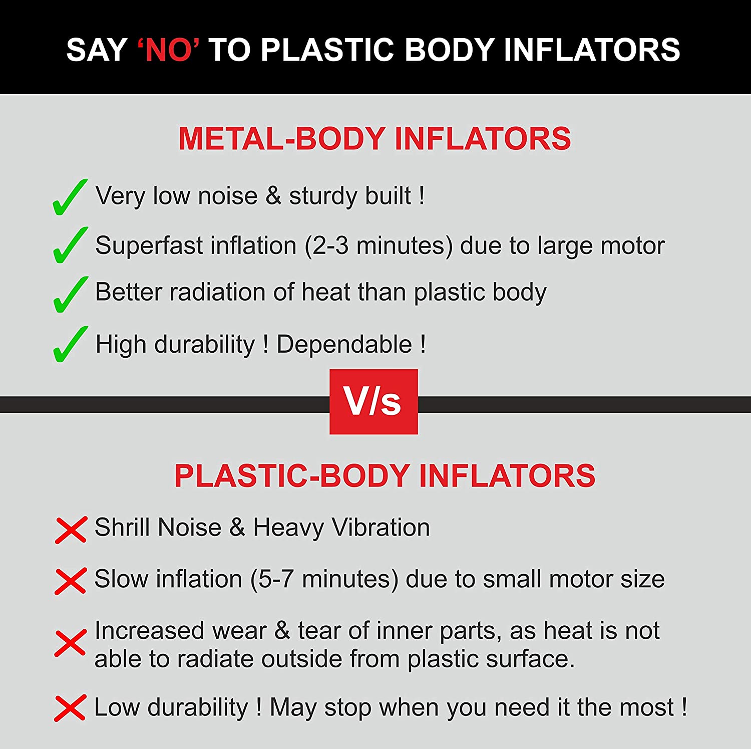 Typhoon Digital Heavy-Duty Metal Tyre Inflator which is not just quick, but is sturdy, safe, robust, durable, reliable, ultra-portable and convenient. Its powerful 100% copper motor is designed for efficient long-term operation even under harsh climatic conditions. Simply plug it in your car’s cigarette lighter socket, fix the hose brass valve to your tyre, set the desired target pressure in PSI and switch it ON. It is super-quick and can inflate a mid-size tyre from 0 to 30 psi in just about 2 minutes. The Digital Pressure Gauge is highly accurate and comes with auto-shut-off feature where the units automatically shuts off when the desired pressure is reached. Plastic body air compressors are delicate, breakable, noisy, have high vibration and are not able to radiate heat generated during compression. A strong heavy-duty metal body which is stronger, sturdier, can radiate heat better and has much lower noise and vibration. The advanced direct-drive 150W heavy-duty 100% copper core motor provides super-fast inflation of 0-30 psi in around 2 minutes! This Typhoon’s high precision, back-lit digital gauge has preset and auto shut-off functions. Simply set the desired pressure and the unit will shut automatically. Pure Brass nozzle covered with thermoplastic material to prevent finger burn. Thick, braided (knitted), heat-proof, rat-proof, rubber air hose for tyre inflation. Typhoon Digital Heavy-Duty Metal Tyre Inflator come with 4 bright LED lights for comfortable use during night, low light or dark conditions, with a high quality FREE Storage bag to keep your device safely in your car, with free nozzles to inflate toys, inflatable beds, basketballs, footballs, bicycles, floats etc. You also have a bright LED light which would prove very handy during use in dark or low light conditions. Its high quality braided (knitted) rubber air-hose is heat and wear resistant. Durable metal body is grounded by anti-vibration rubber feet to prevent unwanted movement. There is no periodic maintenance required and the design is oil-free. Extra nozzles have been provided for inflating toys, balls and water sport equipment. Unlike other plastic inflators which are delicate and noisy, This Typhoon is an all-metal. solid-build, heavy-duty, tough and reliable air inflator. Overall a great product!