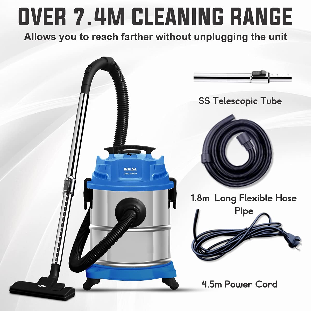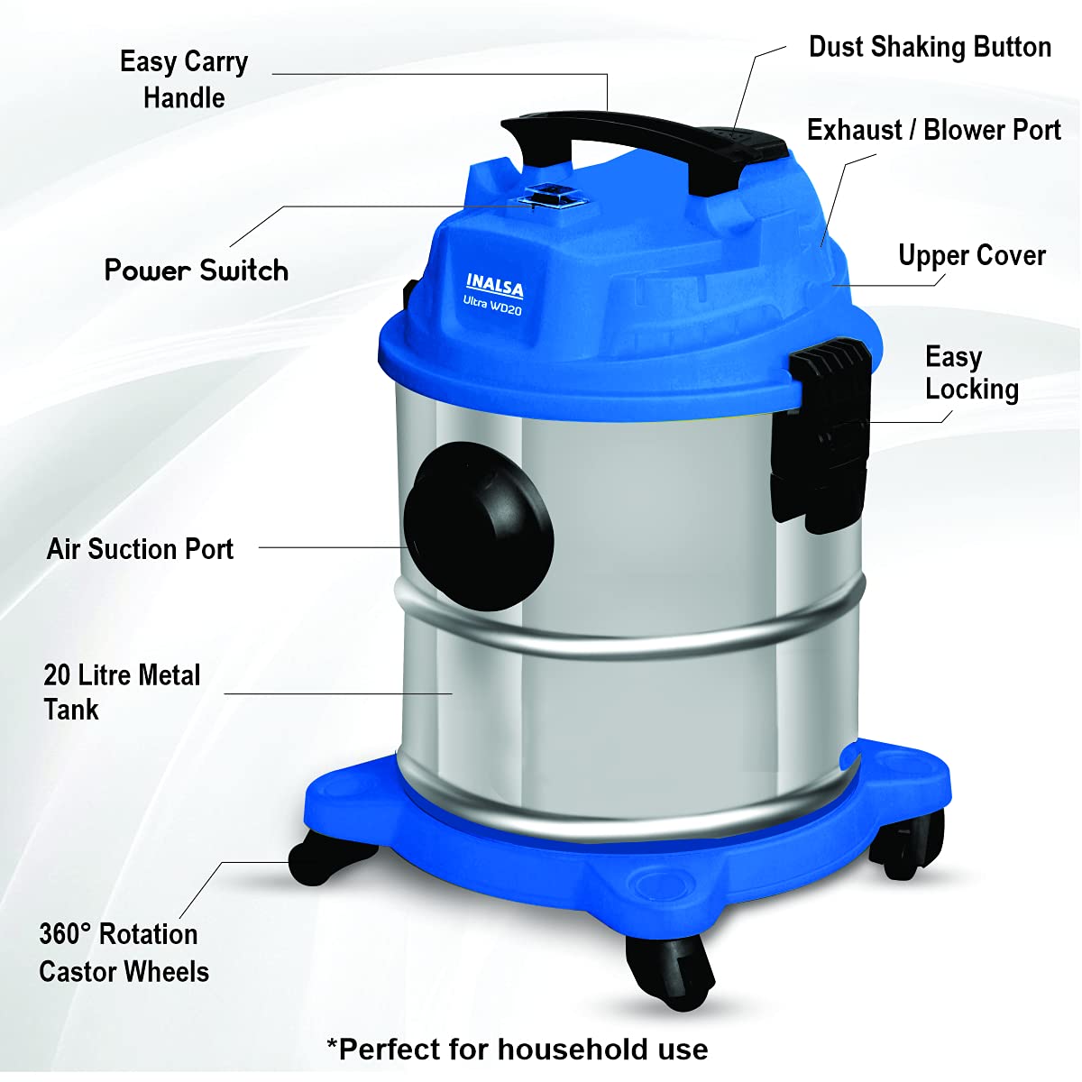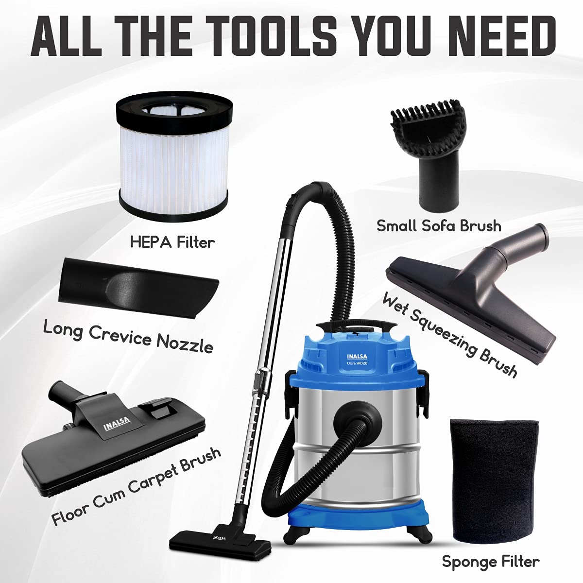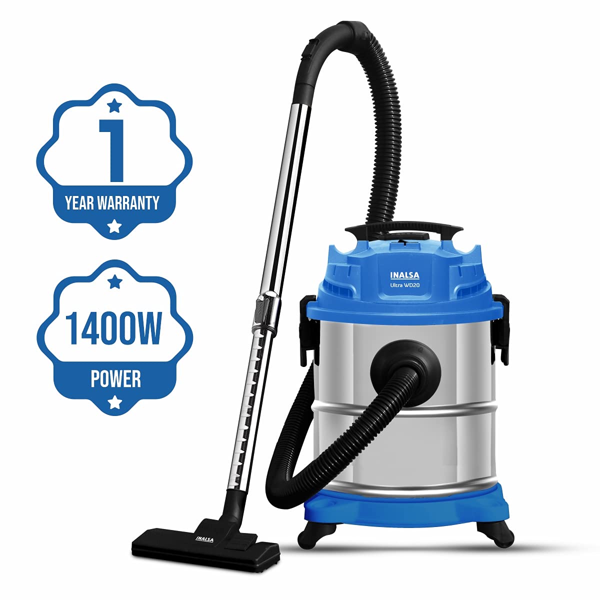 Wet & Dry Vacuum Cleaner is a 3-in-1 Vacuum Cleaner. No matter it is dust, hair, daily waste, leaf waste, liquid drop or spillage on the floor, the device cleans it all. Use HEPA filter for dry dust collection, use sponge filter for wet collection and do not use any filter for long use for blowing. 1400 Watt Powerful Motor delivers 17 kpa strong suction power and ensures longer operation. 20 Litres Stainless Steel Tank, Ergonomic Carry handles and 360° rotating castor wheels that allow freedom of movement.